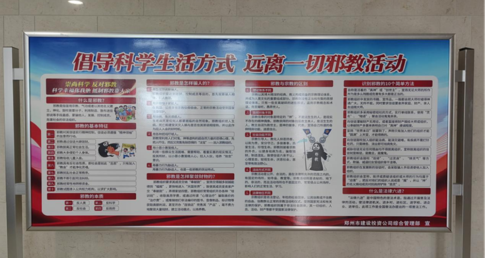 為了進(jìn)一步提高國企員工反邪教意識(shí),認(rèn)識(shí)邪教的危害,切實(shí)增強(qiáng)自覺抵御邪教侵蝕的能力,營造積極向上、健康和諧的工作氛圍。4月25日下午,鄭州市建設(shè)投資集團(tuán)有限公司組織全體干部員工開展反對(duì)邪教宣傳活動(dòng)。利用PPT宣講、宣傳展板、網(wǎng)站、懸掛橫幅等方式,向員工宣傳邪教的種類、危害和邪教組織的種類等,引導(dǎo)國企干部職工認(rèn)清邪教本質(zhì),提高識(shí)邪、防邪、拒邪能力,筑牢反邪教思想防線,做到對(duì)邪教歪理邪說不聽、不看、不信、不傳。