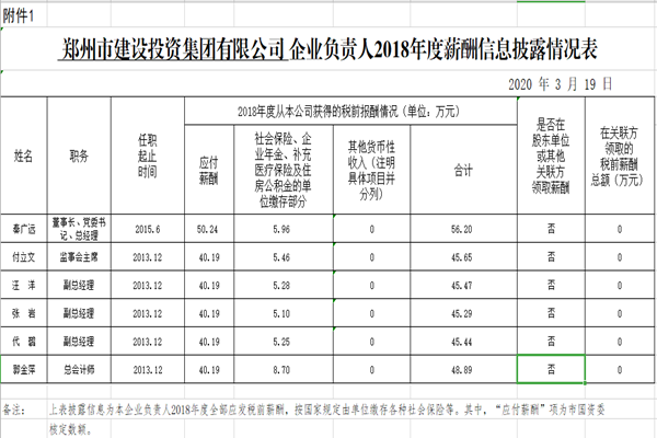 鄭州市建設投資集團有限公司企業(yè)負責人2018年度薪酬信息披露情況表